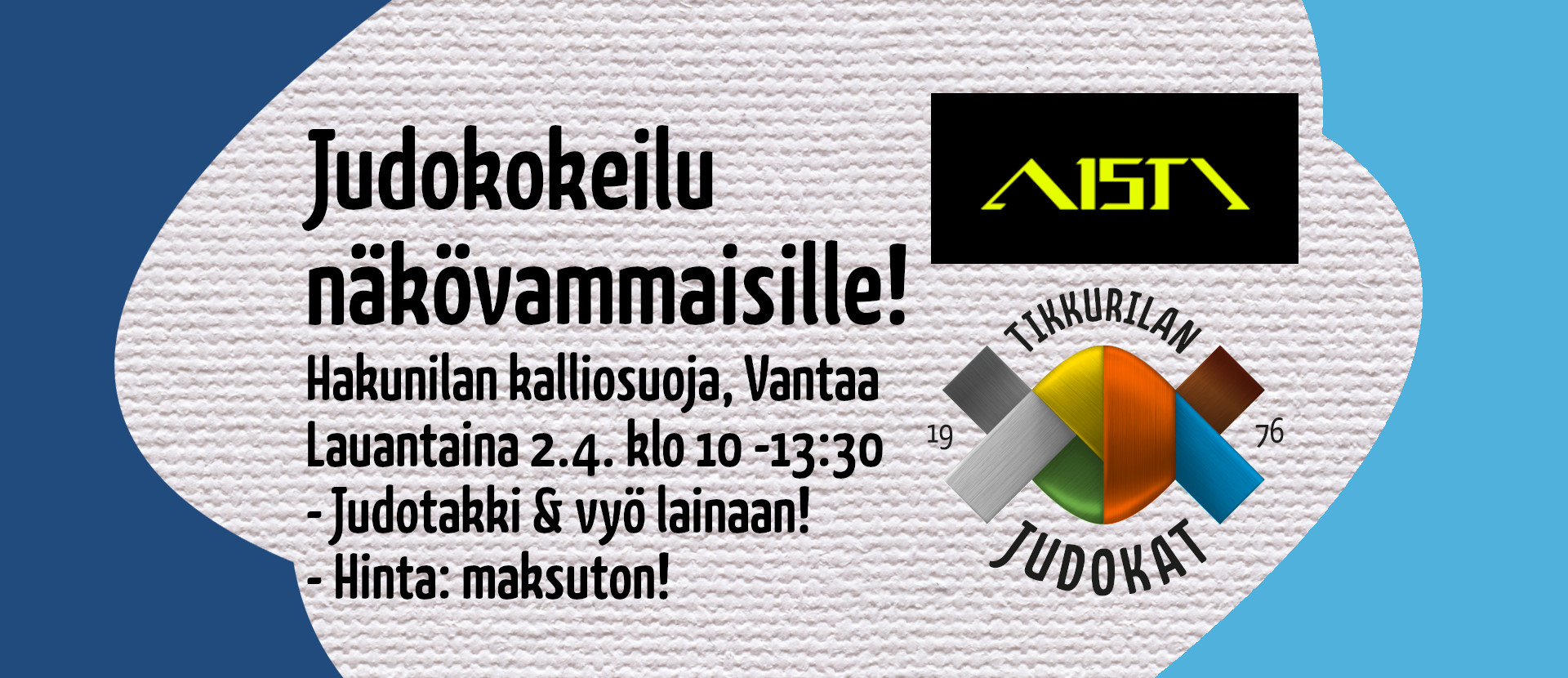 ”Tervetuloa Tikkurilan Judokoiden ja Aisti Sportin järjestämään näkövammaisille suunnattuun judokokeiluun lauantaina 2. huhtikuuta!