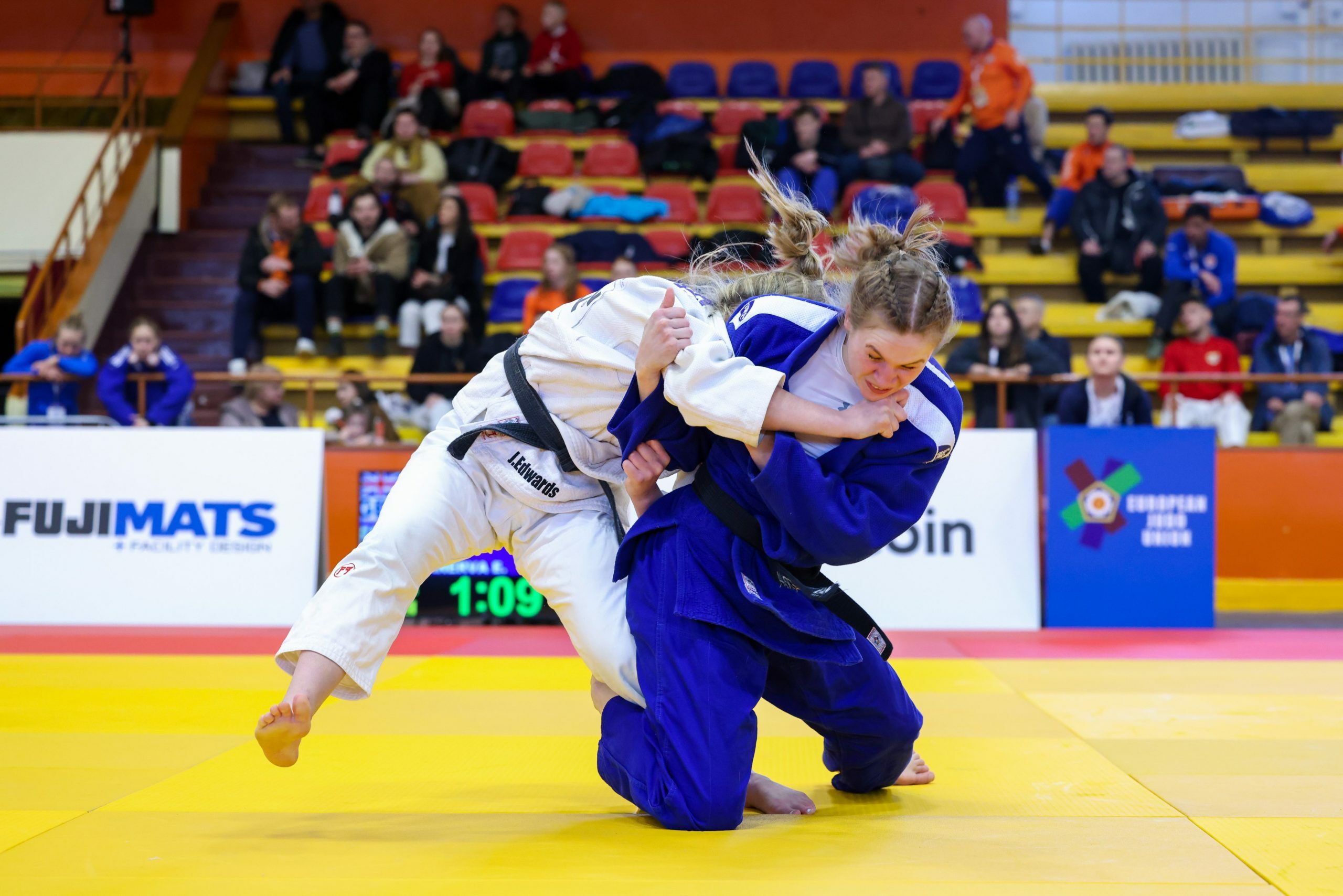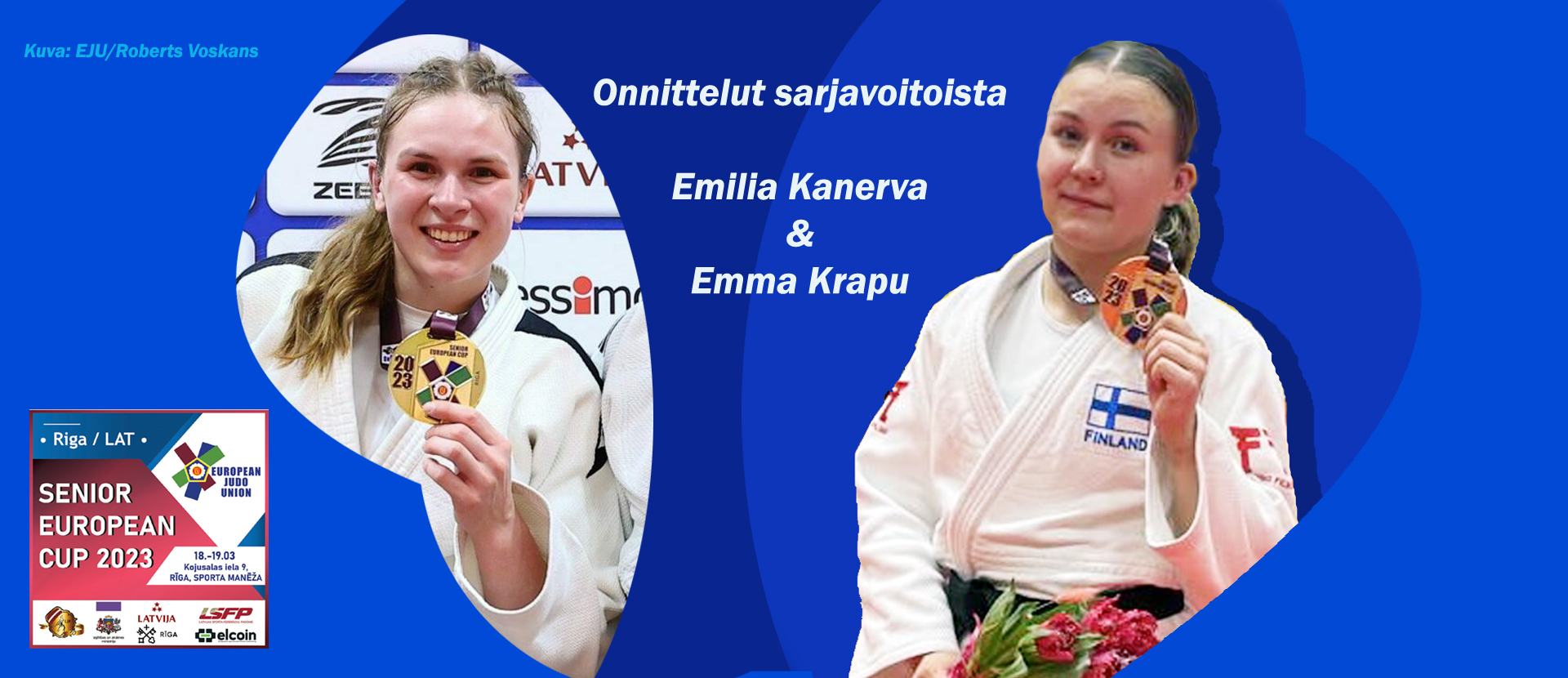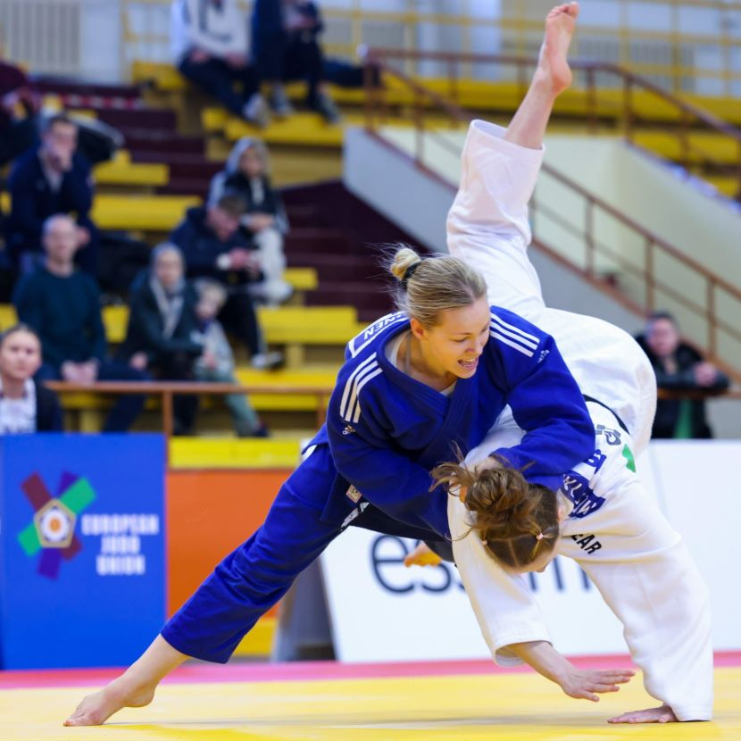 Kirkkonummen Judoseuraa edustavan Emilia Kanervan sarjavoittoon naisten -63 kiloisissa vaadittiin lauantaina neljä jatkoaikaottelua. Alkuotteluissa tiukimman vastuksen antoi lohkofinaalissa Iso-Britannian Jessie Edwards, joka kolmen minuutin jatkoajan jälkeen liputettiin ulos. Finaalissa Kanerva sai urakoida vielä pidempään, sillä Hollannin Kamile Nalbat hallitsi hivenen ottelua varoitusten ollessa 2-1 hollantilaisen eduksi. Jatkoajan viidennellä minuutilla Kanerva kuitenkin ratkaisi ottelun itselleen waza-arin arvoisella ouchigari-jalkaheitolla. Näin Emilialle kultaa Riikasta.