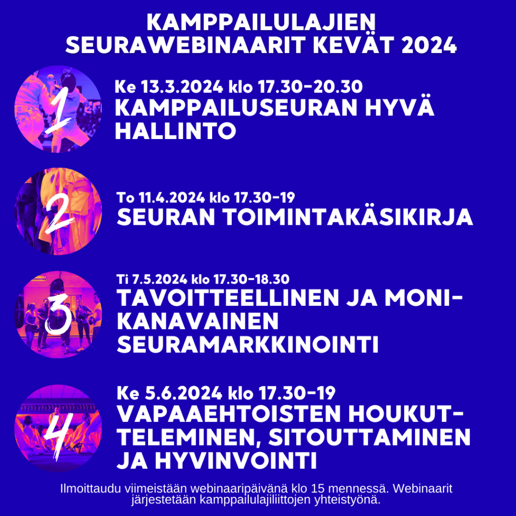 Kevään aikana järjestetään neljä seuratoimintaa kehittävää ja ajatuksia herättävää seurawebinaaria. Webinaarisarja on tarkoitettu kaikille kamppailulajiliittojen jäsenseuroille. Osallistu siis yhteen tai vaikka kaikkiin! Hinta koko webinaarisarjalle on 50€. Yksittäisen webinaarin hinta on 15€. Webinaareihin voi jokaisesta seurasta osallistua samaan hintaan useampi henkilö (yksi ilmoittautuu ja maksaa ja jakaa sitten osallistumislinkin eteenpäin seurassa). Webinaarit tallennetaan ja ne […]