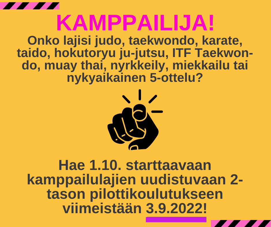 Hae kamppailulajien uudistuvaan 2-tason koulutukseen nyt! TAUSTAA Aiemmin kolmesta eri koulutuspolusta muodostunut 2-taso uudistuu! Uudistuksen myötä kaikkien koulutukseen osallistujien yhteisiin koulutussisältöihin lisätään VOK-perusteiden lisäksi lasten ja nuorten ohjauksen erityispiirteitä ja osaamistavoitteita sekä vastuullisuuden teemoja. Lisäksi osallistuja voi valita painopisteeksi lasten ja nuorten ohjauksen, aikuisharrastajien ohjaamisen tai urheiluvalmennuksen. SISÄLLÖT 2-tasolla tavoitteena on, että valmentaja osaa suunnitella, ohjata ja […]